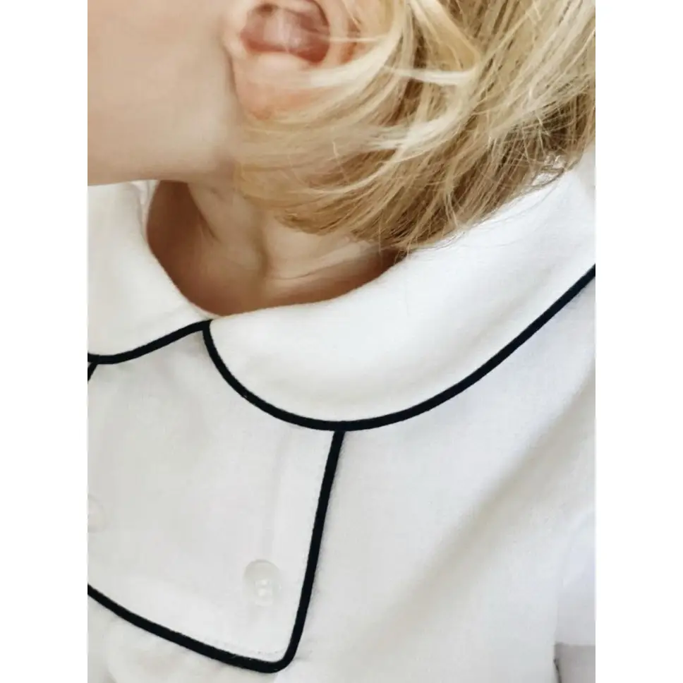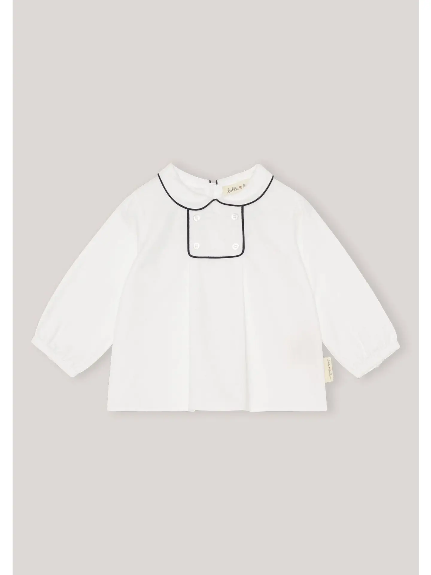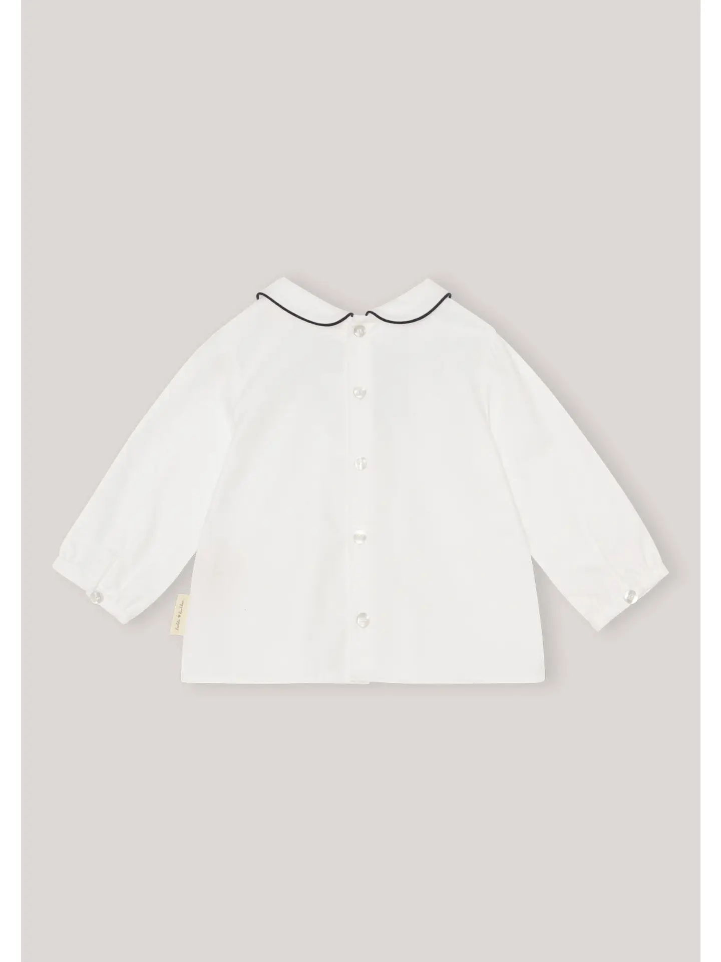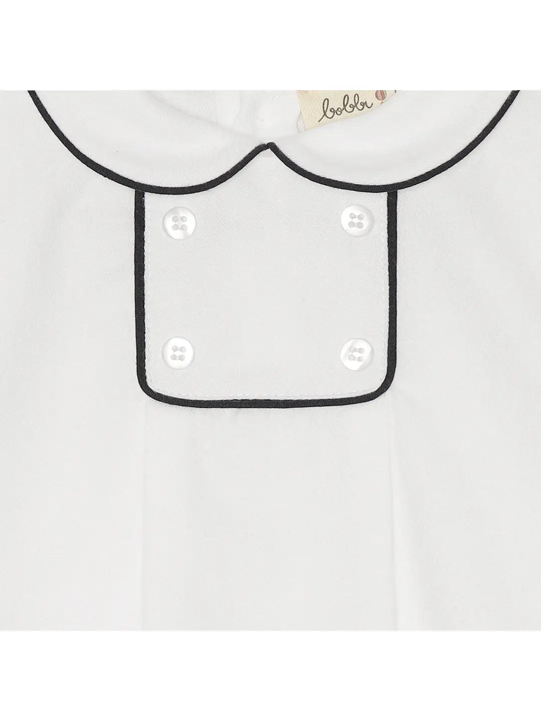 La camisa más encantadora con cuello clásico ribeteado en azul marino. La apertura trasera cuenta con botones de nácar.  Esta camisa está hecha del algodón más suave peinado, garantizando comodidad para el bebé.