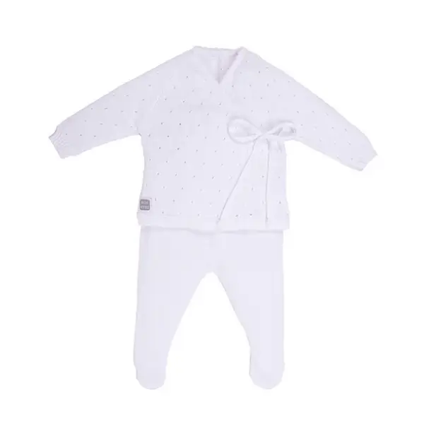 El jersey es de manga larga y tiene un tejido de calados, con un cierre de lazo en el lateral lo que facilita el cambio del bebé.