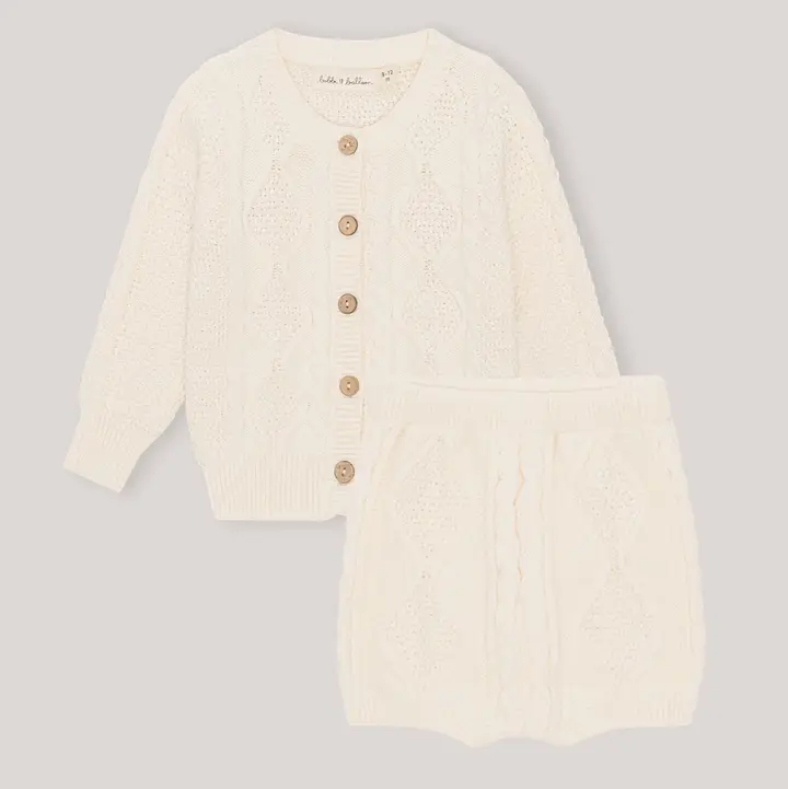 El clásico conjunto de cárdigan y pantalones cortos de punto en nuestro suave color crema mantequilla. 100% algodón