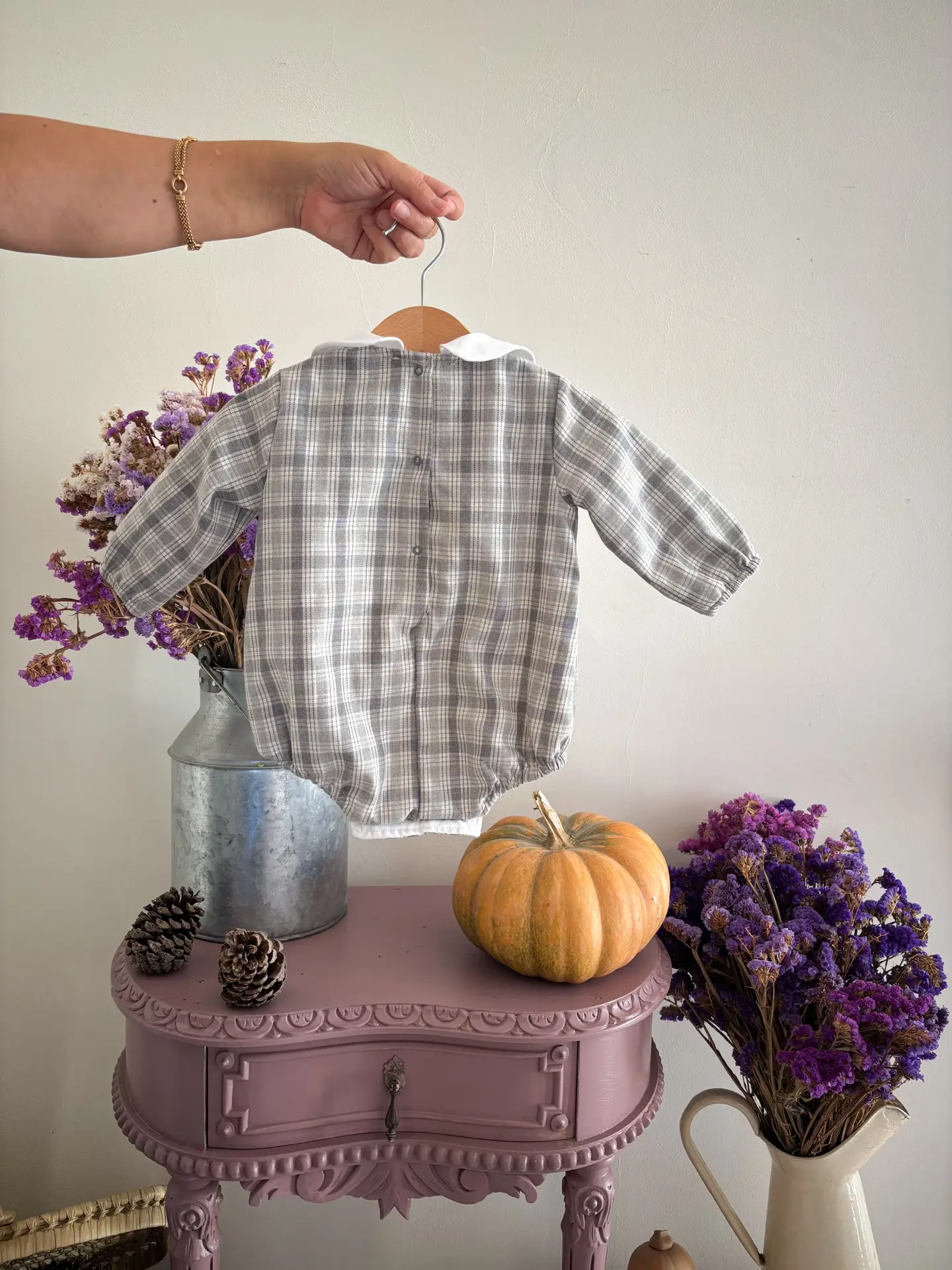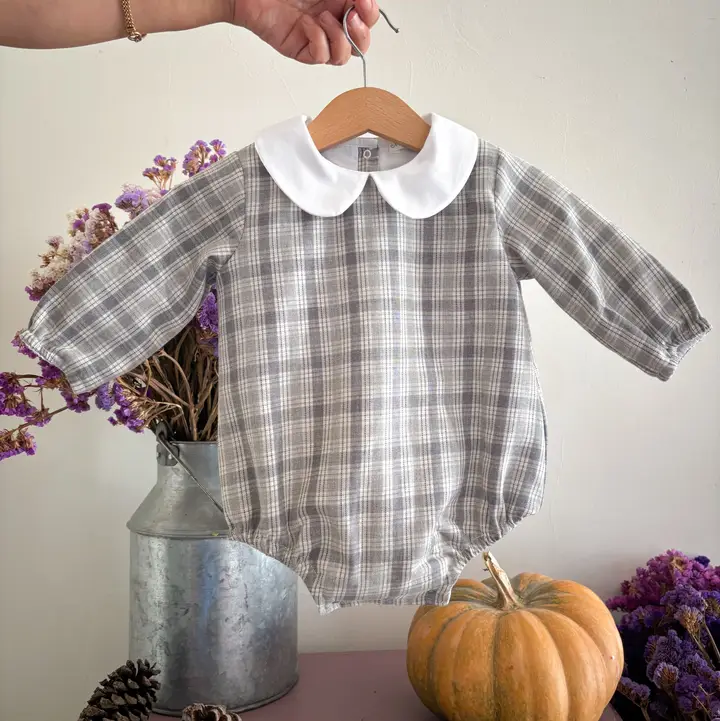 Suave con cuello Peter Pan en cuadros grises. Un imprescindible. Composición: Viella y forrado 100% algodón. Corchetes en la entrepierna y la espalda.