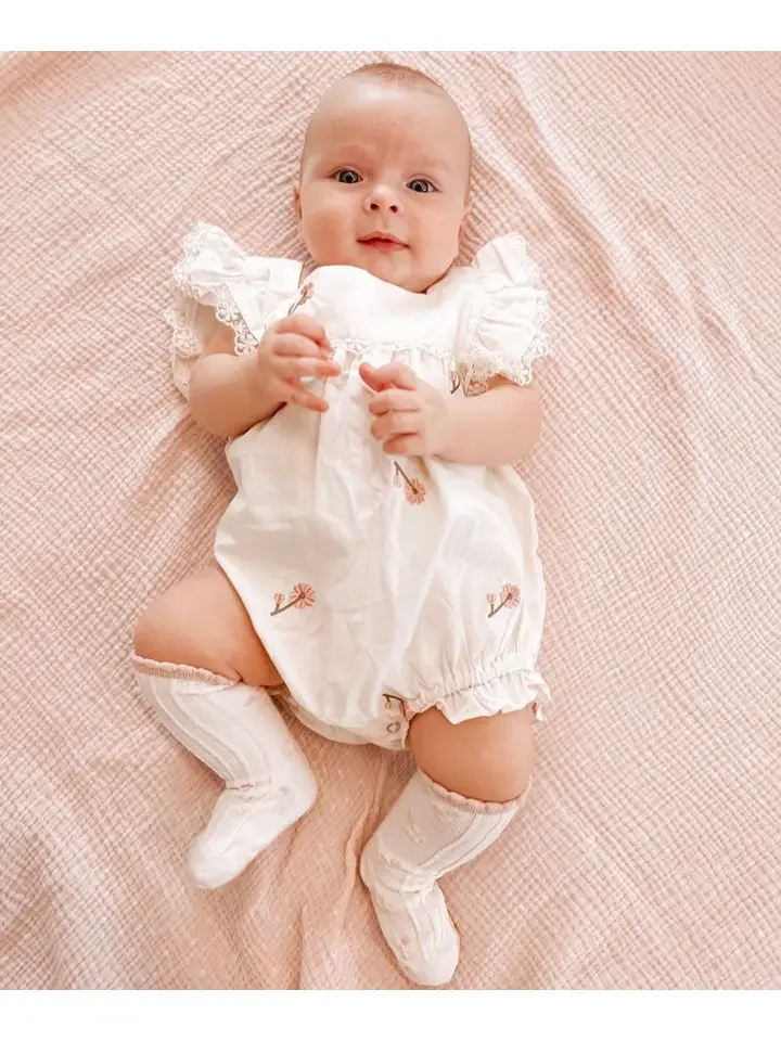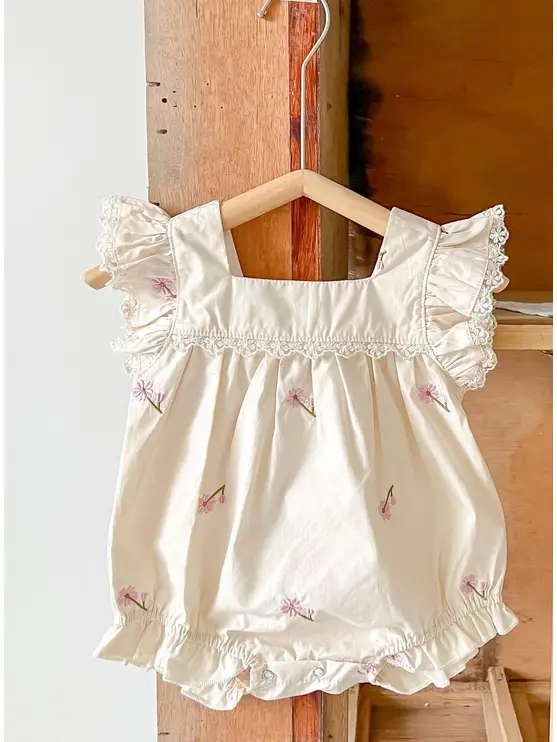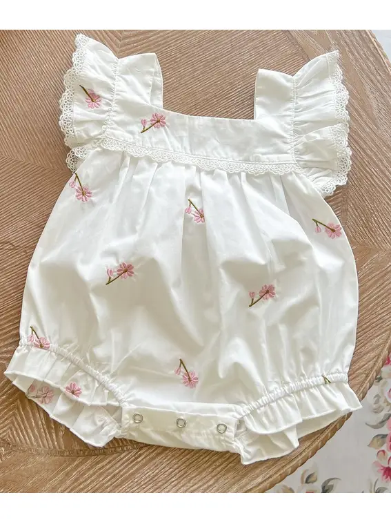 Adorable mono corto de algodón para bebé con flores y volantes. Disponible en dos colores diferentes.