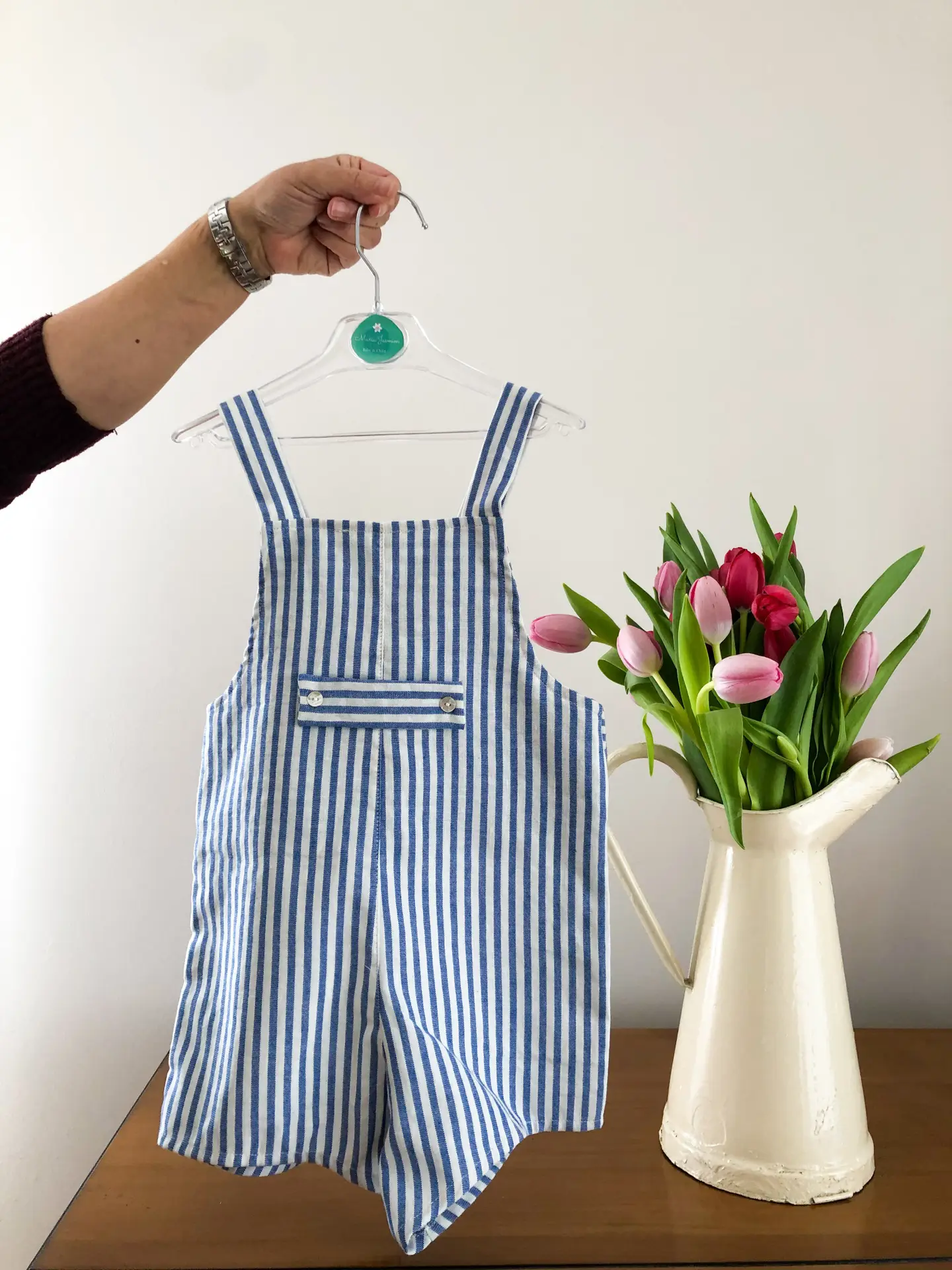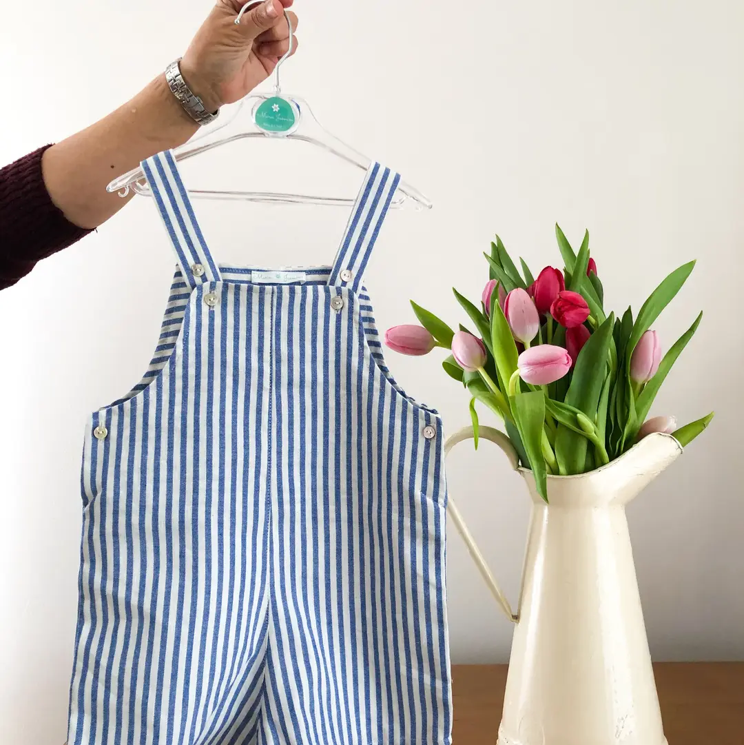 Peto a rayas azules, súper versátil y práctico, imprescindible. Composición: 100 % algodón.