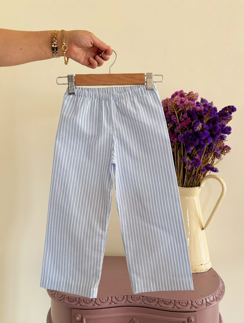 Pijama de rayas azules y blancas, compuesto por blusa y pantalón. Composición: 100 % algodón.
